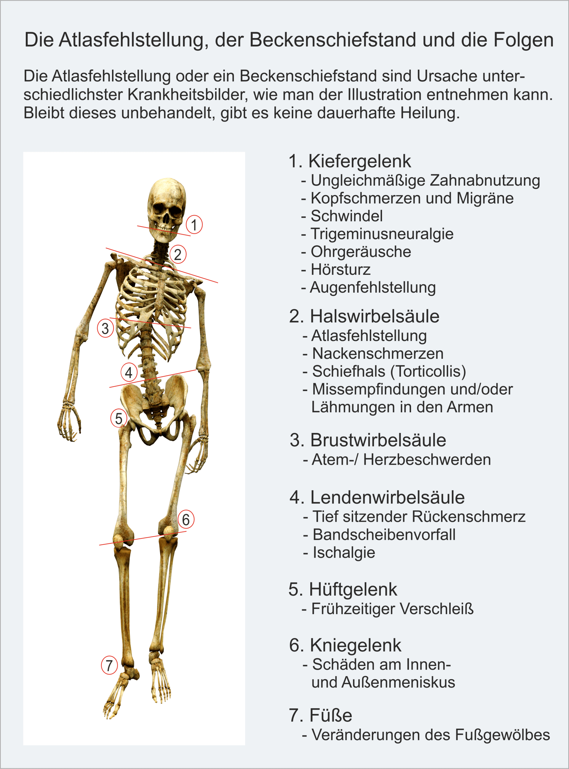 Alles in unserem Körper hängt miteinander zusammen. Der Atlaswirbel ist das Bindeglied zwischen zentraler Steuerung des Kopfes einerseits und dem gesamten Skelettsystem, den inneren Organen, Gefäßen und Drüsen bis hin zu den sensorischen Fasern der Füße. Fehlstellungen des Atlaswirbels und hieraus resultierende Gesundheitsstörungen sind in der Schulmedizin schlicht und einfach nicht bekannt. Ein Blick über den Tellerrand bei verschiedensten Erkrankungen und Beschwerden macht Sinn.(2)